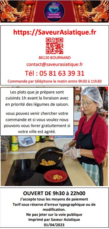Nous venons d'essayer Saveur Asiatique situé à BOURNAND. Nous sommes ravis. Nous avons pris différents petits plats et fritures. La soupe de nouilles 🍜 est juste un délice ! Je recommande vivement !