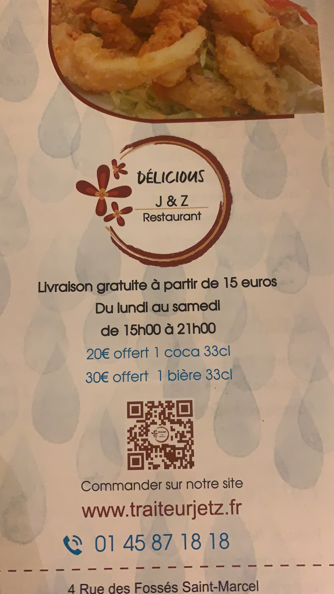 Voici toutes les informations sur le Plats chinois à emporter Traiteur J&Z qui ce trouve au 4 Rue des Fossés Saint-Marcel, 75005 Paris (75). Sur cette fiche vous trouverez les photos, l'adresse, les horaires d'ouverture, le numero de téléphone et les avis clients.Vous pouvez églement rédiger un avis si vous le souhaitez en bas de page.