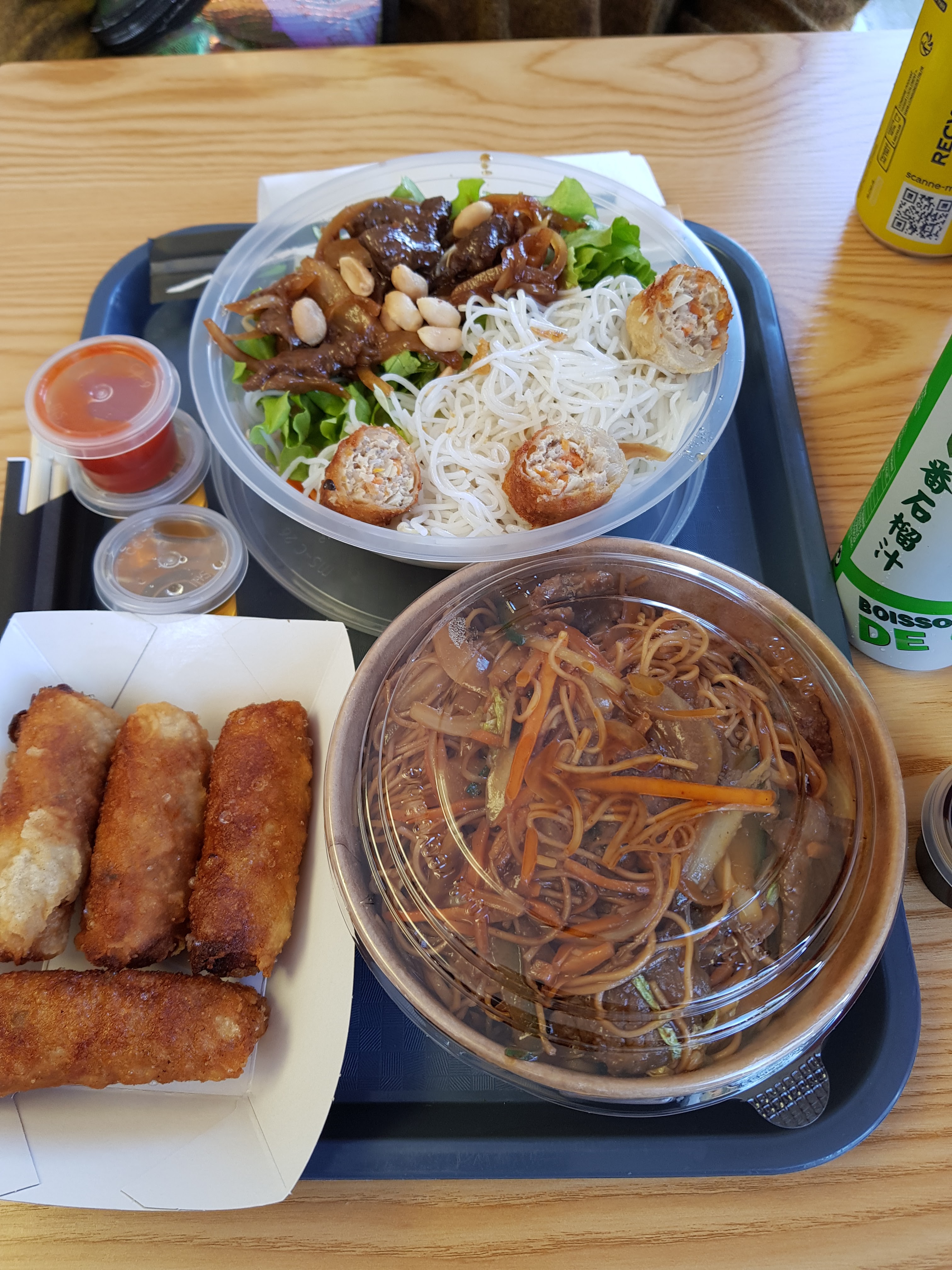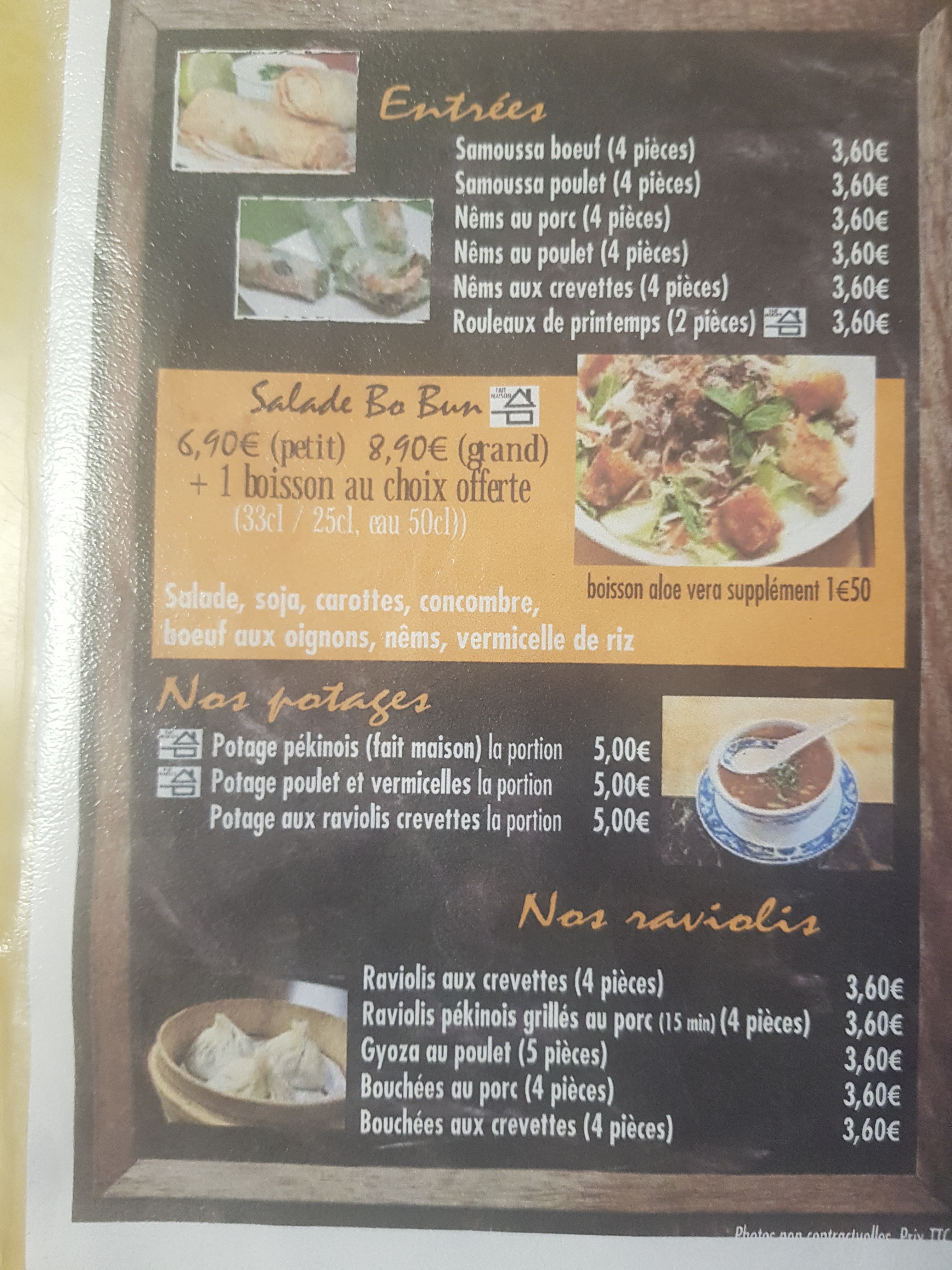 Plats copieux et majoritairement maisons Nem, ravioli, soupe, bol à préparer soi même, ...,tout est délicieux Une adresse à retenir pour déjeuner/dîner chez soi ou rapidement dans ce petit restaurant pour un prix des plus contenu