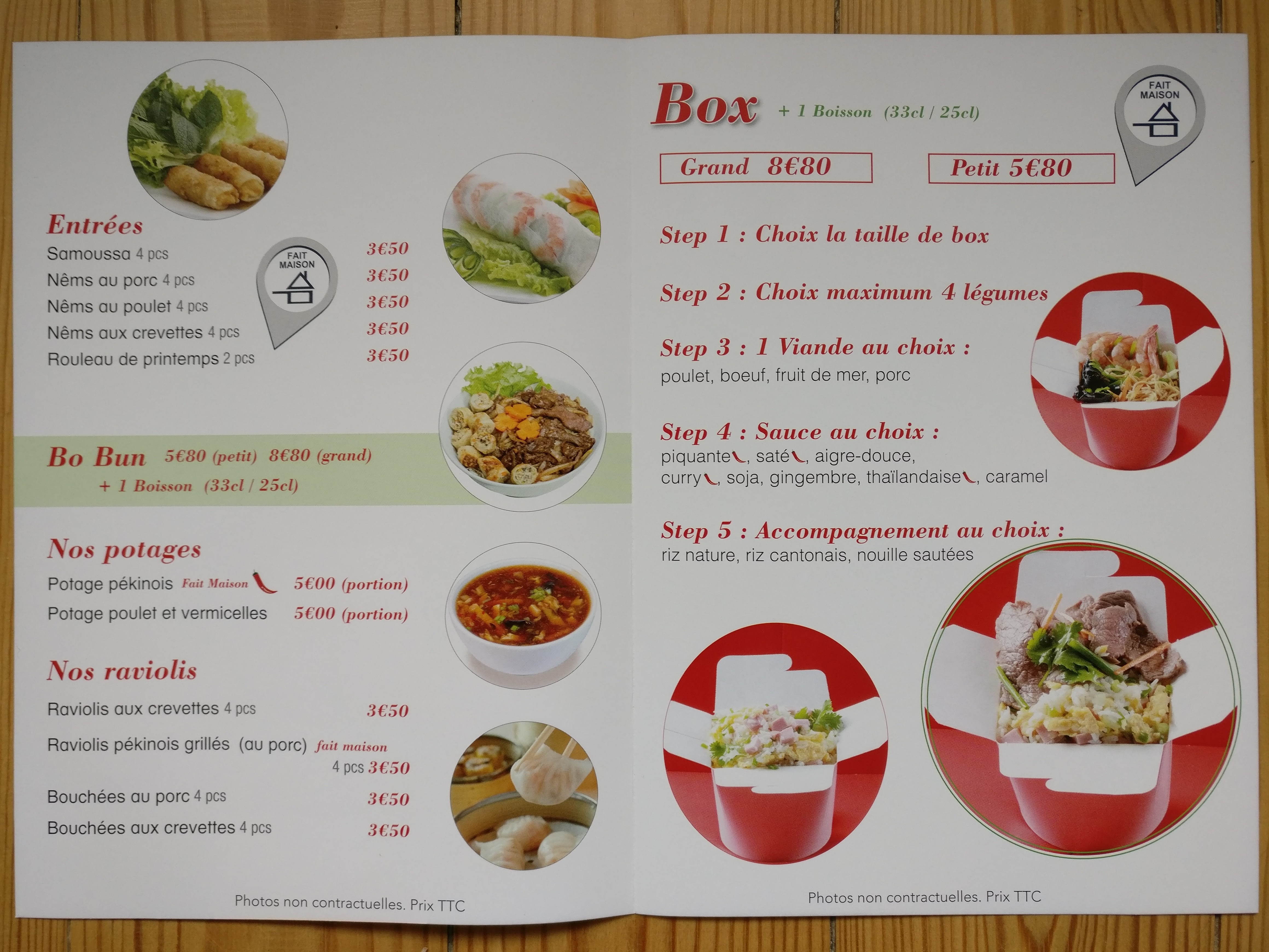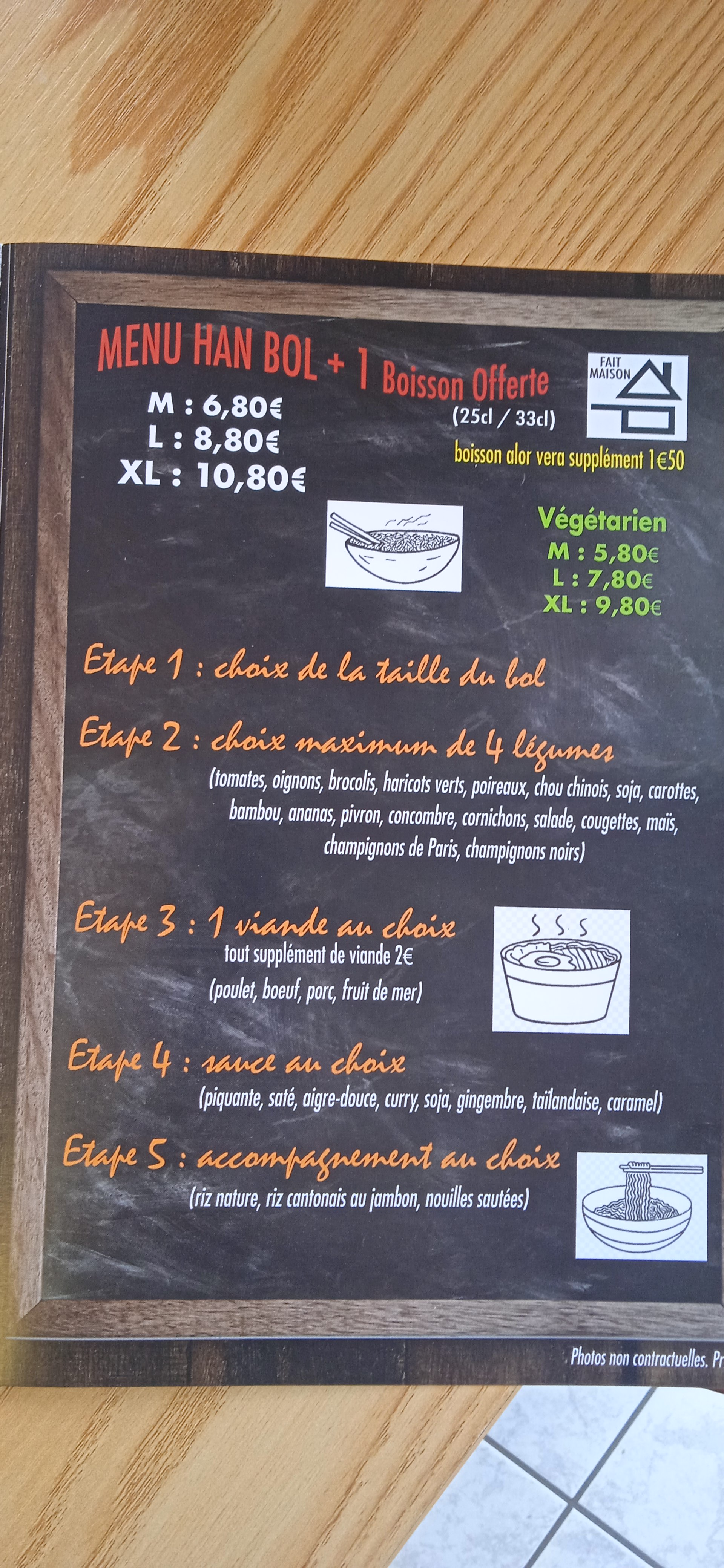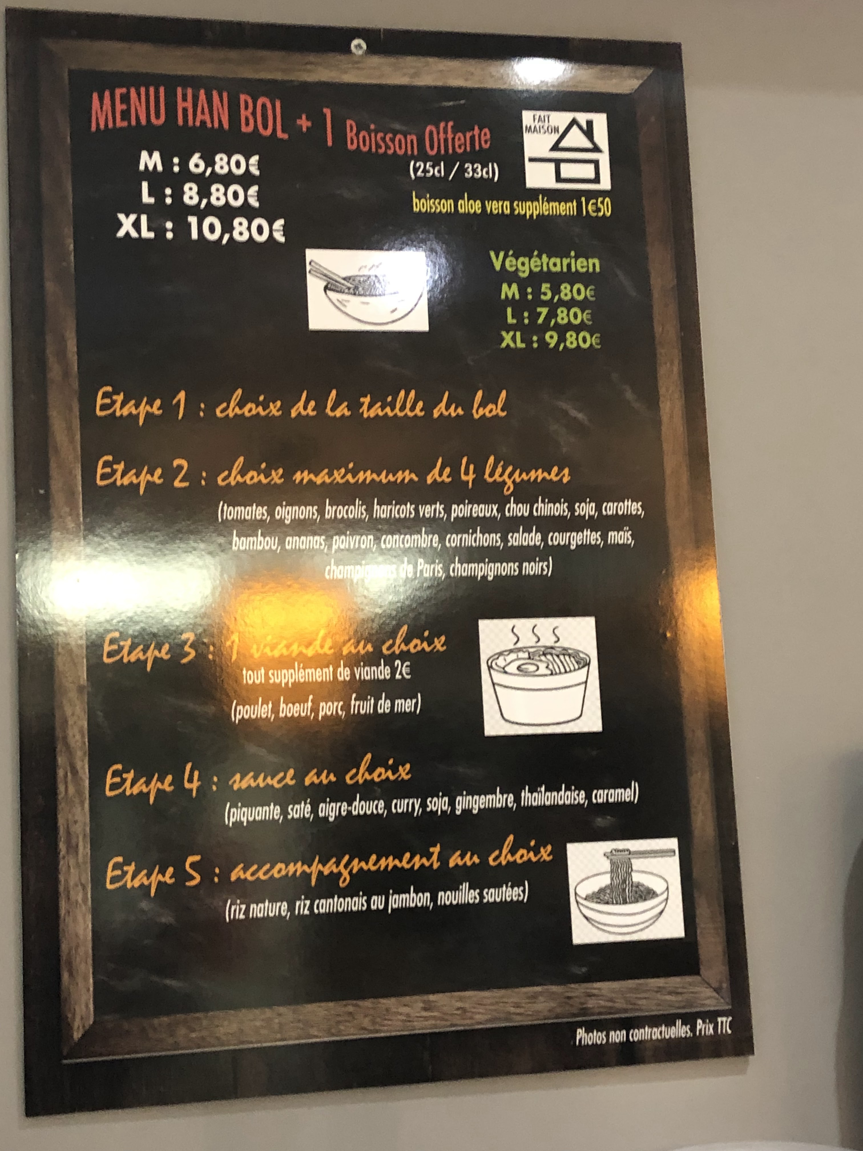 Je prends toujours la grande box de nouilles sautees.... et les légumes que j'aime ! A chaque fois c'est pareil.... je me régal! Je recommande fortement.